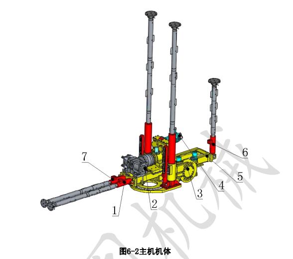 鉆機(jī)為整體式布局,由主機(jī)機(jī)體、履帶車體、電機(jī)泵組輸出裝置、操作機(jī)構(gòu)、油箱總成、冷卻器組件及電控箱支撐架等部分組成,各部分之間用高壓膠管和螺栓連接,結(jié)構(gòu)緊湊,可靠性高。